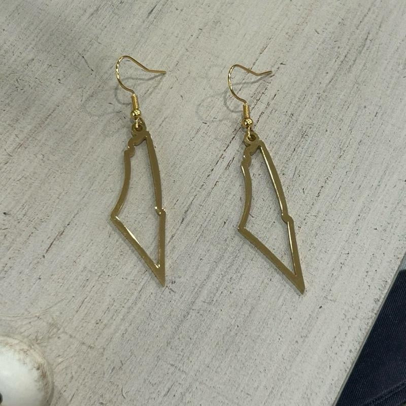 These elegant gold-tone outline earrings shape the map of Palestine. They're lightweight and symbolic, ideal for daily wear or thoughtful gifts. Showcasing Palestinian resilience and identity, these earrings make a meaningful accessory. Perfect for those who appreciate cultural heritage in jewelry.
